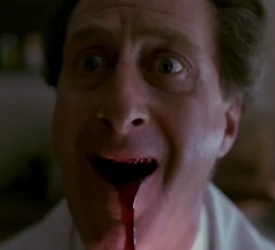 Bukowski is soon sprung from the mental hospital by infected crazies and emerges to hack up body parts with a power saw to an intense saxophone and wah-guitar soundtrack. An attending physician is rendered literally speechless when his tongue is bitten off.
