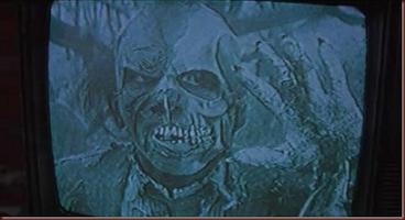 There are so many inspired bits in The Video Dead. Jeff being used as zombie bait and hanging from a tree like a petulant pinata amuses as does the scene when Zoe, who’s told by the Garbageman that she’ll survive if she shows no fear, invites the video dead in and serves them a straight-from-the-can dinner that looks more unpalatable than the usual zombie sustenance of brains and entrails.