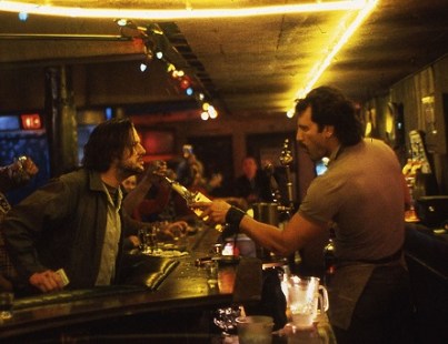 Henry Chinaski (Mickey Rourke) is the regal title drunk, a wastrel and would-be novelist who needs “fuel” to take out nemesis Eddie the Bartender (terrifically portrayed with thug-menace by Frank Stallone). He finds it in the form of a sandwich, pilfered straight from the grubby hands of a fatso at the end of the bar, and proceeds to lay out Eddie with a savage beating.