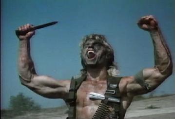 At this point, many questions arise. For instance, why when Danton throws one knife, two people fall down and die? Was there some sort of ricochet? And just how does a machine gun act like a bazooka, causing a helicopter to explode as if a nuclear missile hit it? Furthermore, we know that Danton is good but is he from Krypton? The man has grenades thrown at him and is shot point black and emerges literally without a scratch! And why is that when a man shoots a machine gun in an action film, he makes the same face Eddie Van Halen does when ripping out a guitar solo?