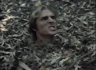Upon seeing the corpses of his mercenaries, Hogan – a poor man’s Martin Kove if there ever was one – exclaims “I know his style, it’s my style…Know him, I TRAINED him!”Danton then reaches out of the bush, grabs Hogan, turns him around and growls:
